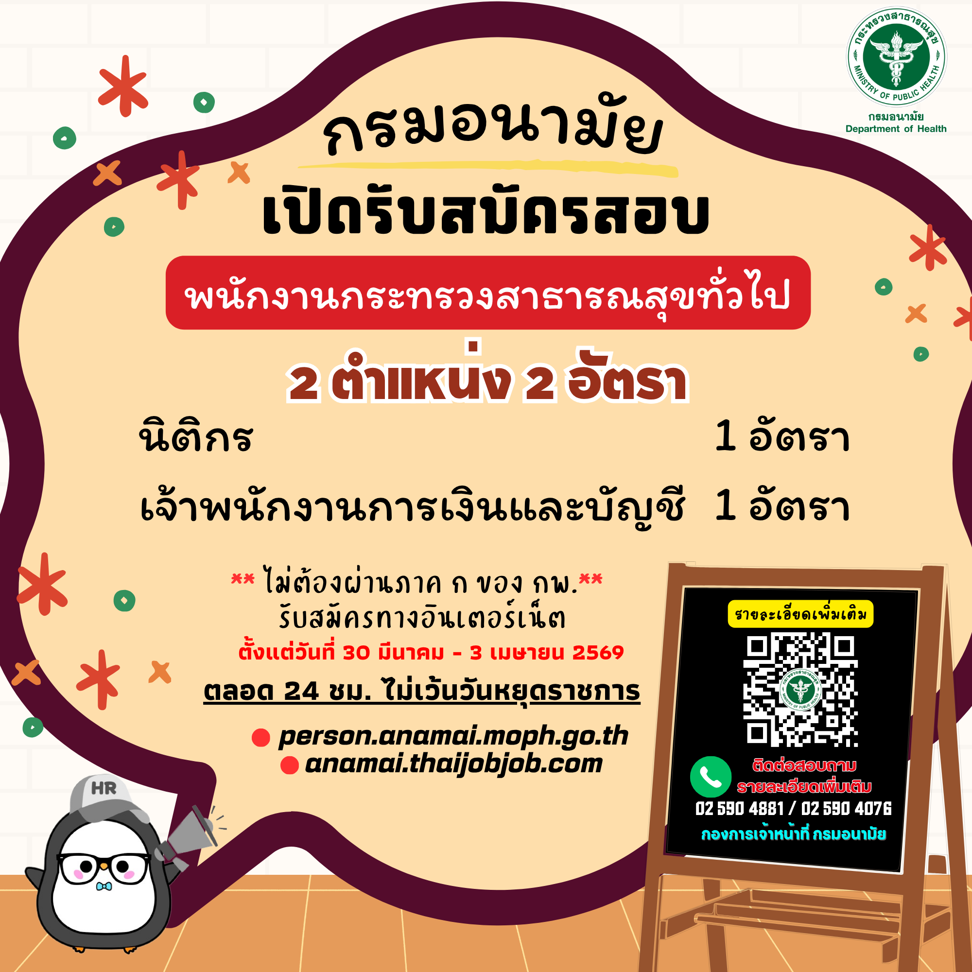 ประกาศกรมอนามัย เรื่อง รับสมัครบุคคลเพื่อเลือกสรรเป็นพนักงานกระทรวงสาธารณสุขทั่วไป สังกัดหน่วยงานส่วนกลาง ปีงบประมาณ พ.ศ. ๒๕๖๙ ตำแหน่งนิติกร และตำแหน่งเจ้าพนักงานการเงินและบัญชี สมัครได้ทางอินเทอร์เน็ต ตั้งแต่วันที่ ๓๐ มีนาคม ๒๕๖๙ ถึงวันที่ ๓ เมษายน ๒๕๖๙ ตลอด ๒๔ ชั่วโมง ไม่เว้นวันหยุดราชการ