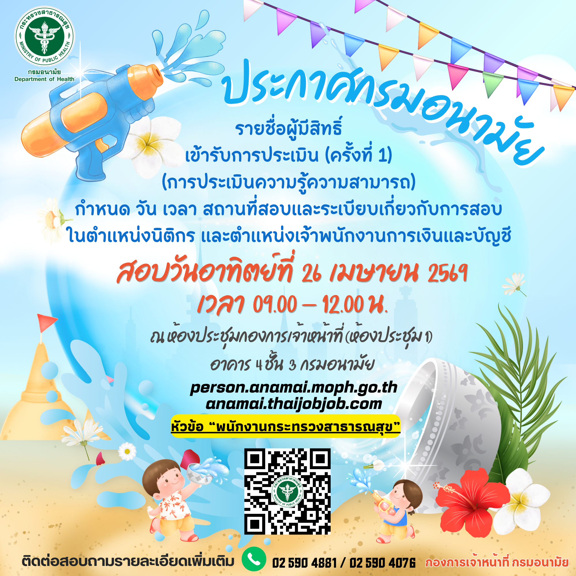 ประกาศกรมอนามัย เรื่อง ประกาศรายชื่อผู้มีสิทธิ์เข้ารับการประเมิน ครั้งที่ 1 (การประเมินความรู้ความสามารถ) กำหนดวัน เวลา สถานที่สอบ และระเบียบเกี่ยวกับการสอบในตำแหน่งนิติกร และตำแหน่งเจ้าพนักงานการเงินและบัญชี