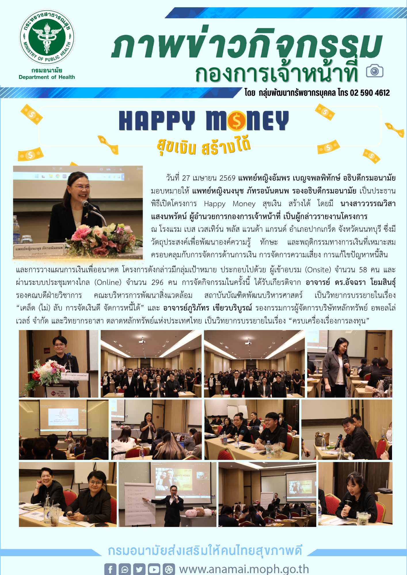 วันที่ 27 เมษายน 2569 แพทย์หญิงอัมพร เบญจพลพิทักษ์ อธิบดีกรมอนามัย มอบหมายให้ แพทย์หญิงนงนุช ภัทรอนันตนพ รองอธิบดีกรมอนามัย เป็นประธานพิธีเปิดโครงการ Happy Money สุขเงิน สร้างได้ โดยมี นางสาววรรณวิสา แสงนพรัตน์ ผู้อำนวยการกองการเจ้าหน้าที่ เป็นผู้กล่าวรายงานโครงการ ณ โรงแรม เบส เวสเทิร์น พลัส แวนด้า แกรนด์ อำเภอปากเกร็ด จังหวัดนนทบุรี ซึ่งมีวัตถุประสงค์เพื่อพัฒนาองค์ความรู้ ทักษะ และพฤติกรรมทางการเงินที่เหมาะสม ครอบคลุมกับการจัดการด้านการเงิน การจัดการความเสี่ยง การแก้ไขปัญหาหนี้สิน และการวางแผนการเงินเพื่ออนาคต โครงการดังกล่าวมีกลุ่มเป้าหมาย ประกอบไปด้วย ผู้เข้าอบรม (Onsite) จำนวน 58 คน และผ่านระบบประชุมทางไกล (Online) จำนวน 296 คน การจัดกิจกรรมในครั้งนี้ ได้รับเกียรติจาก อาจารย์ ดร.อัจฉรา โยมสินธุ์ รองคณบดีฝ่ายวิชาการ คณะบริหารการพัฒนาสิ่งแวดล้อม สถาบันบัณฑิตพัฒนบริหารศาสตร์ เป็นวิทยากรบรรยายในเรื่อง “เคล็ด (ไม่) ลับ การจัดเงินดี จัดการหนี้ได้” และ อาจารย์ภูริภัทร เขียวบริบูรณ์ รองกรรมการผู้จัดการบริษัทหลักทรัพย์ อพอลโล่ เวลธ์ จำกัด และวิทยากรอาสา ตลาดหลักทรัพย์แห่งประเทศไทย เป็นวิทยากรบรรยายในเรื่อง “ครบเครื่องเรื่องการลงทุน”